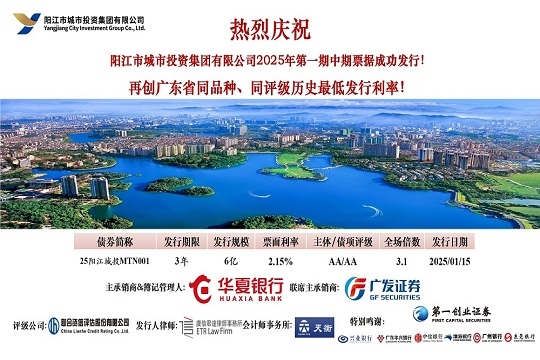 2025年1月15日,市城投集團在中國銀行間交易商協會成功發(fā)行“陽江市城市投資集團有限公司2025年第一期中期票據”。本期債券發(fā)行規(guī)模為6億元,期限為3年,票面利率2.15%,全場倍數超過3.1倍,合計申購機構數23家。本期債...